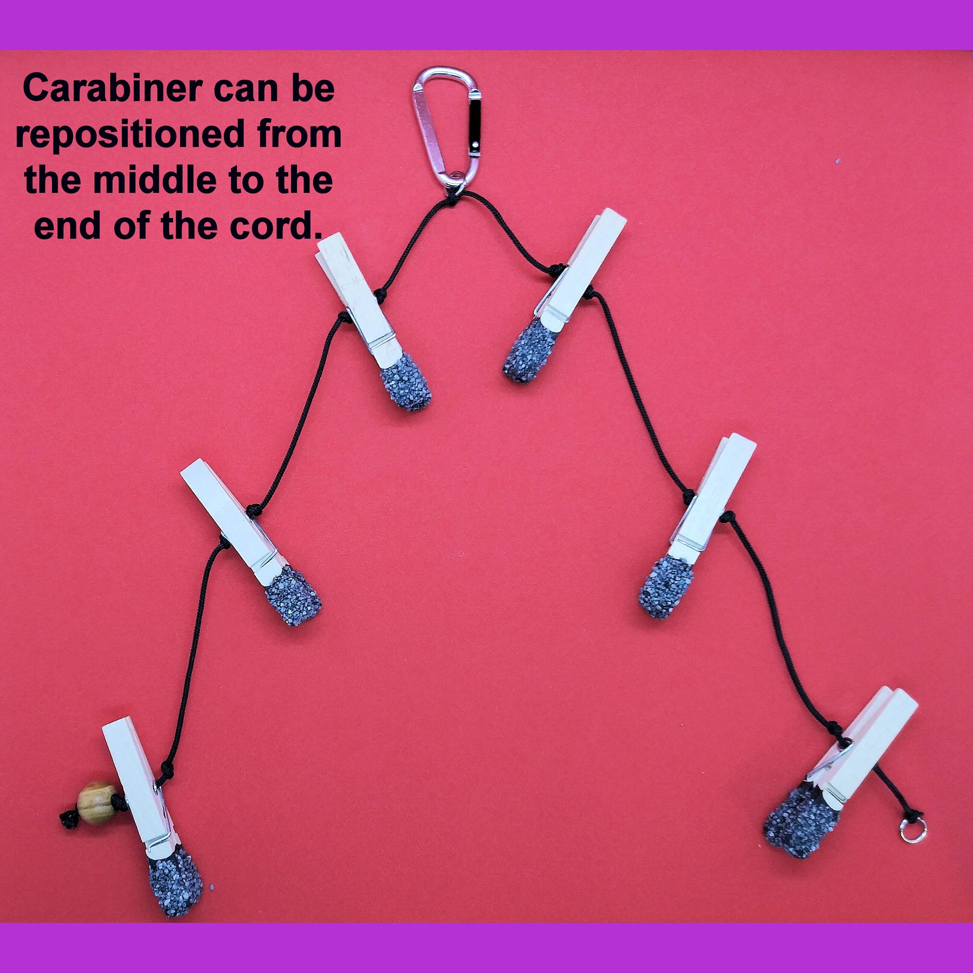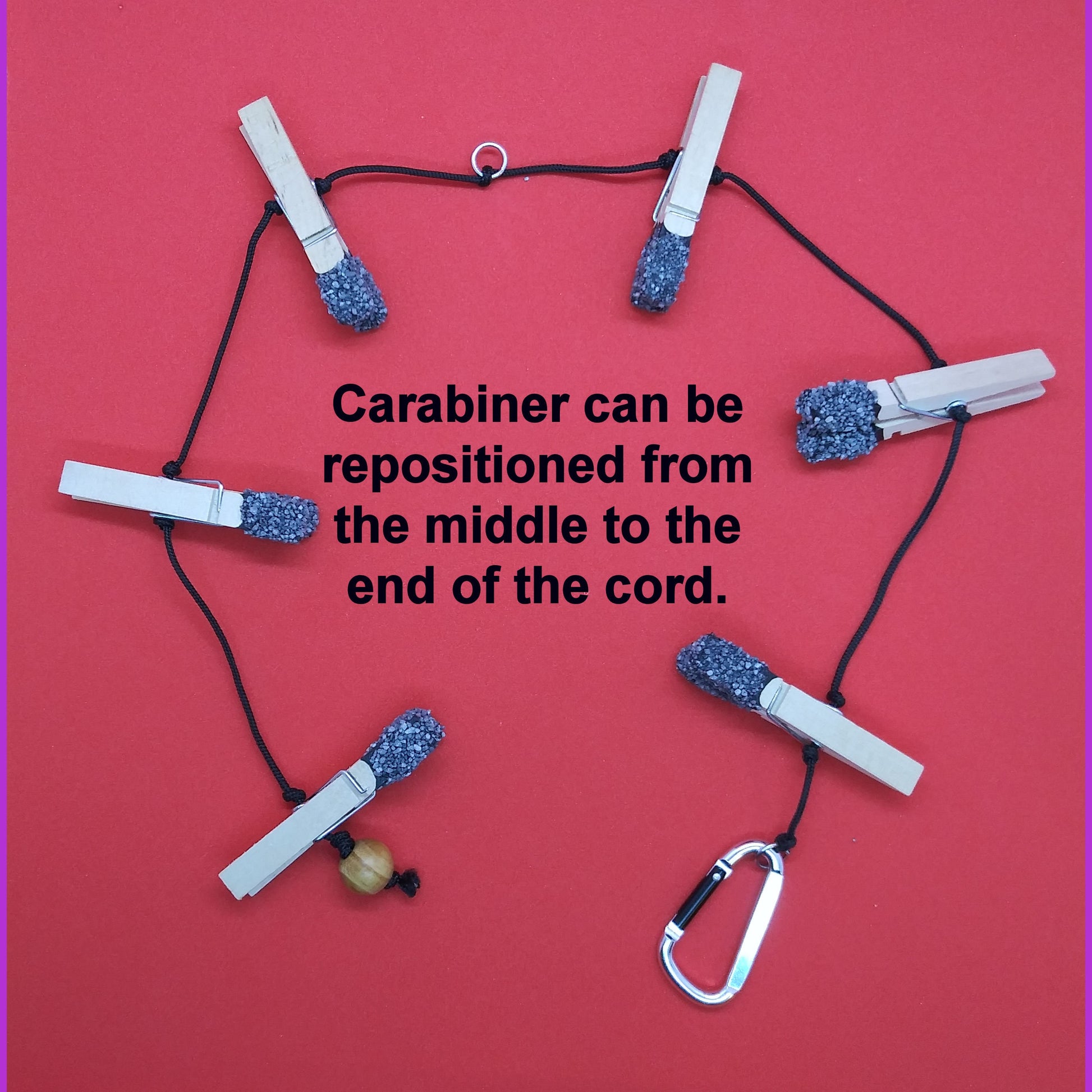 Carabiner can be repositioned to the middle of the 6 clothespins, or to the end of the cord, so that clothespins are pulled off one at a time, or two at a time.