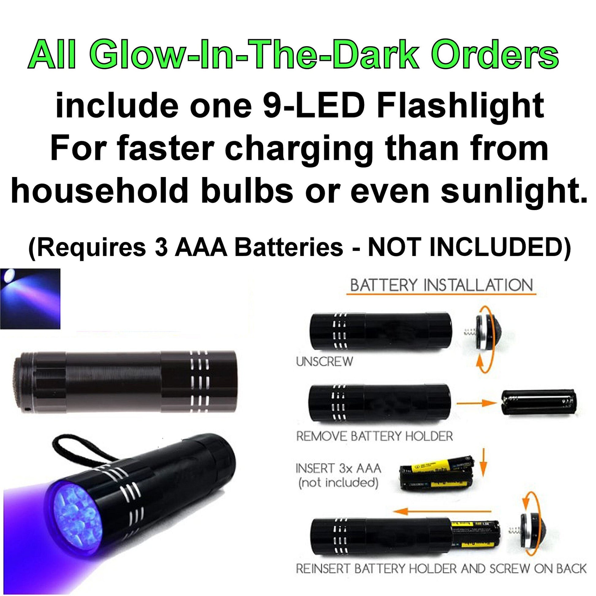 *All Glow-in-the-Dark options need to be charged under a light source to activate their glow-in-the-dark properties. Natural sunlight, or UV/black light will charge fastest, and regular light will also charge with a bit more time.