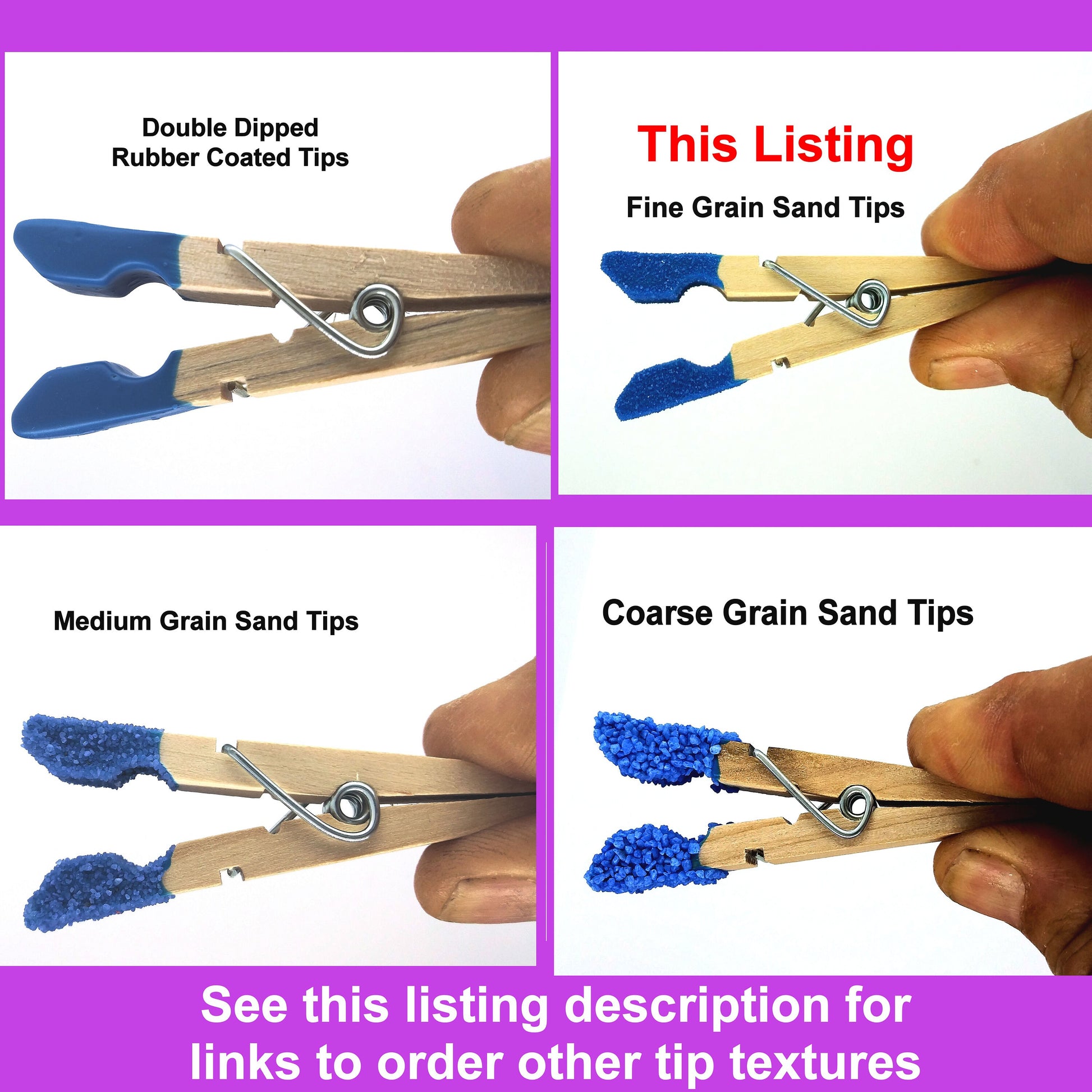 6 Clothespin zipper now available in 10 different colors of clothespins, and 12 different colors of FINE GRAIN sand coated tips.
