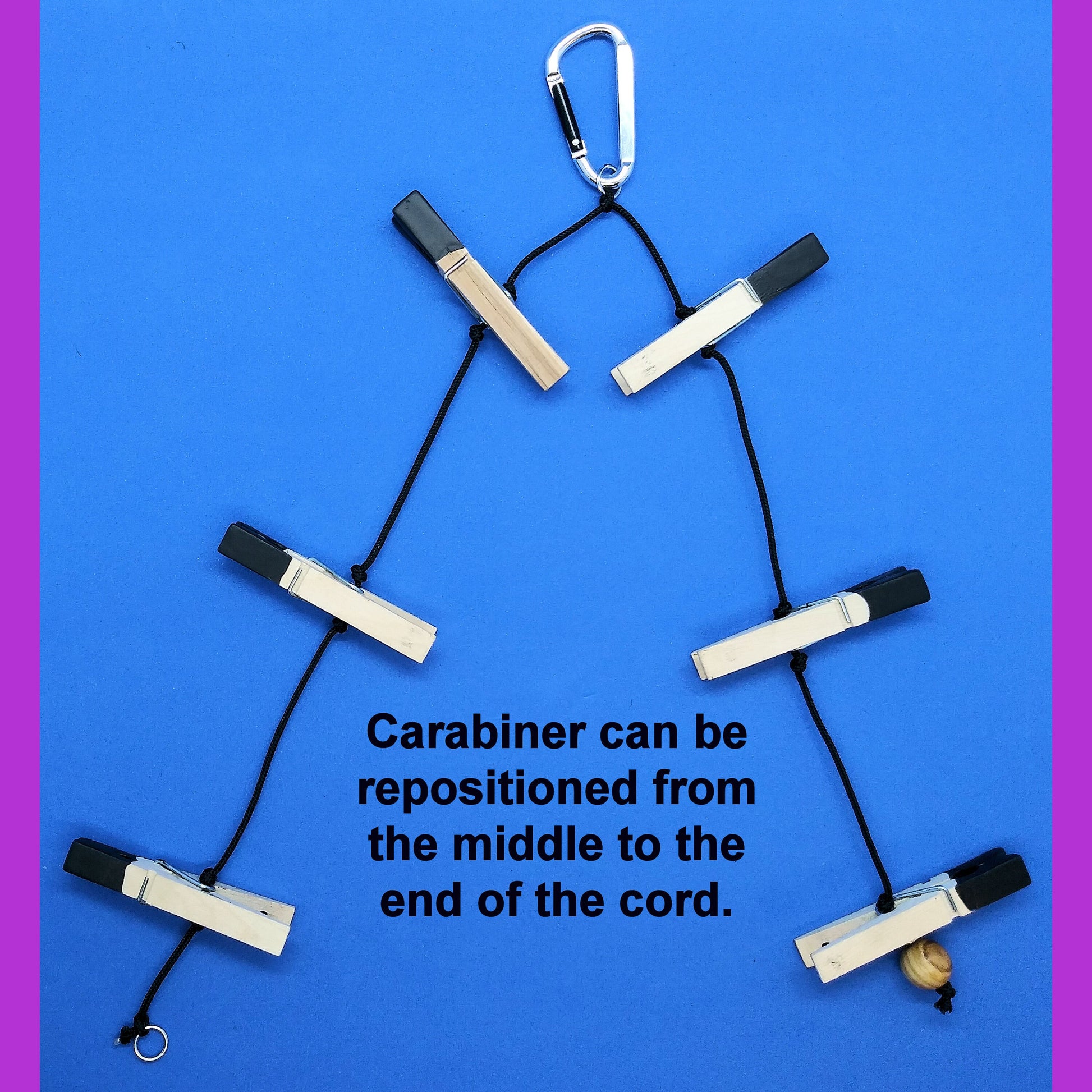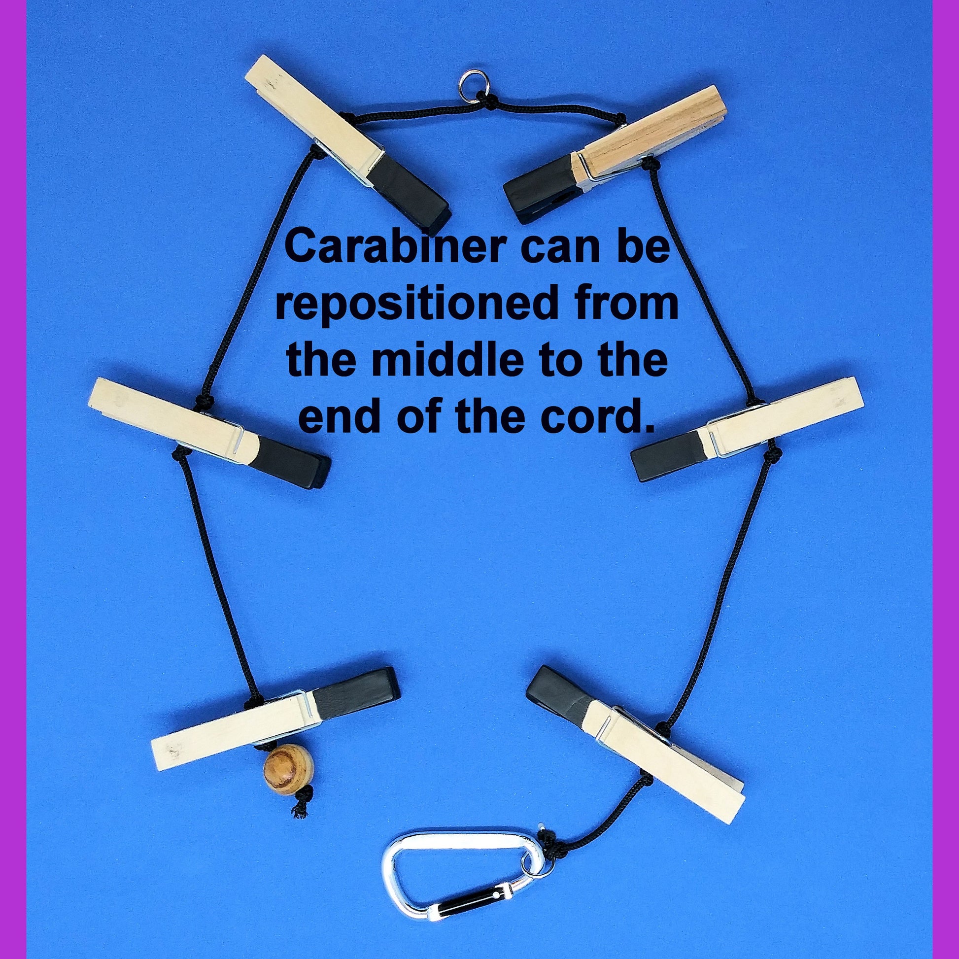 Carabiner can be repositioned to the middle of the 6 clothespins, or to the end of the cord, so that clothespins are pulled off one at a time, or two at a time.