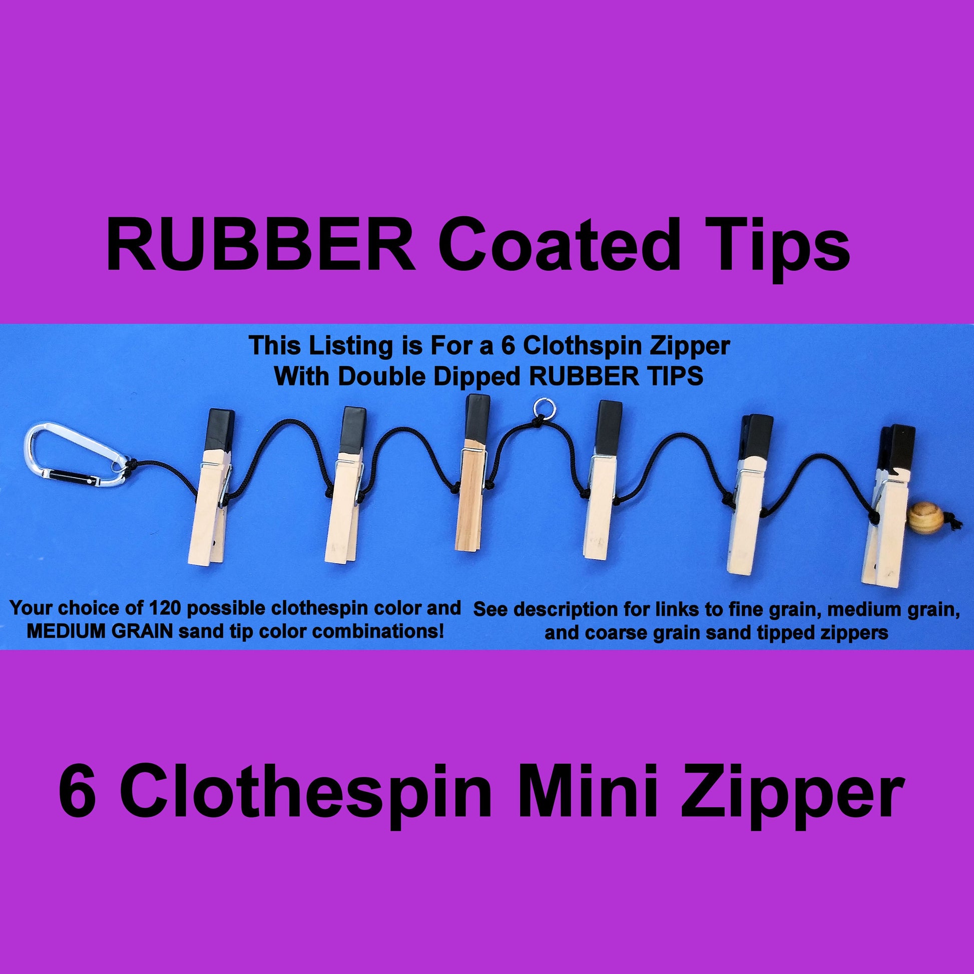 NOTE: This listing is for a 6 Clothespin Zipper with RUBBER DIPPED TIPS. See below for links to FINE GRAIN sand, MEDIUM GRAIN sand, and COARSE GRAIN sand tipped clothespin zippers.