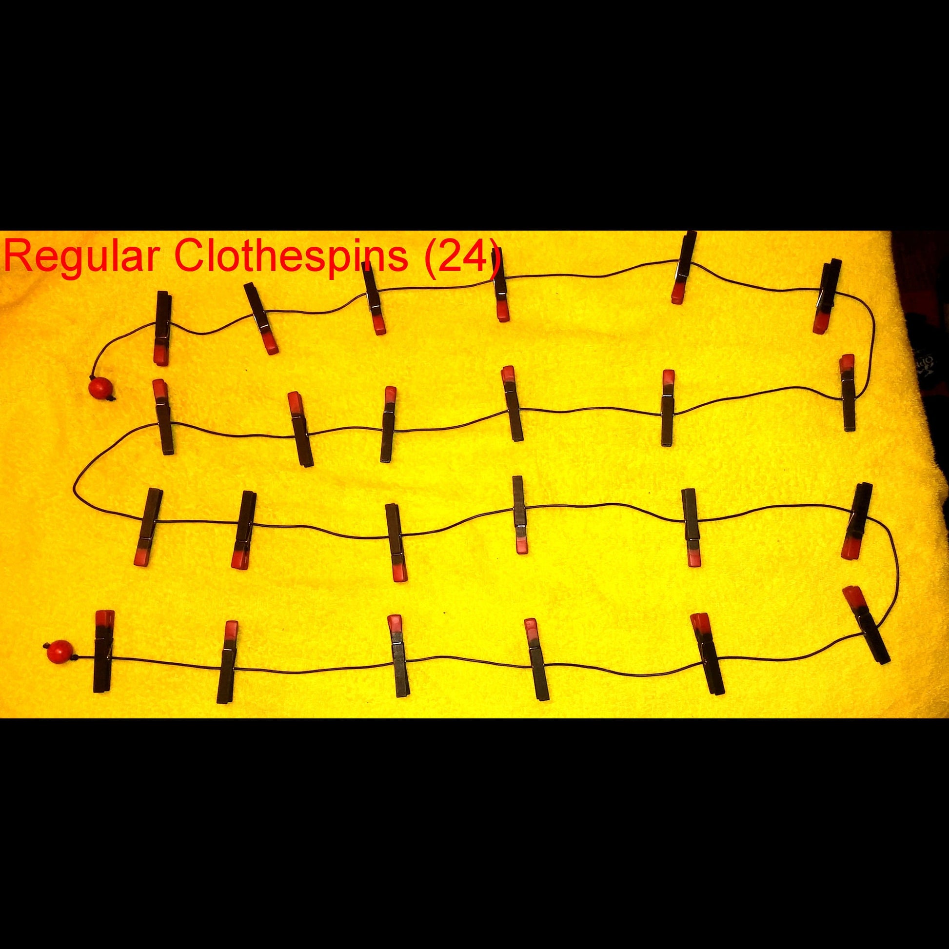 24 clothespins strung and movable on a cord approximately 8 feet long.
