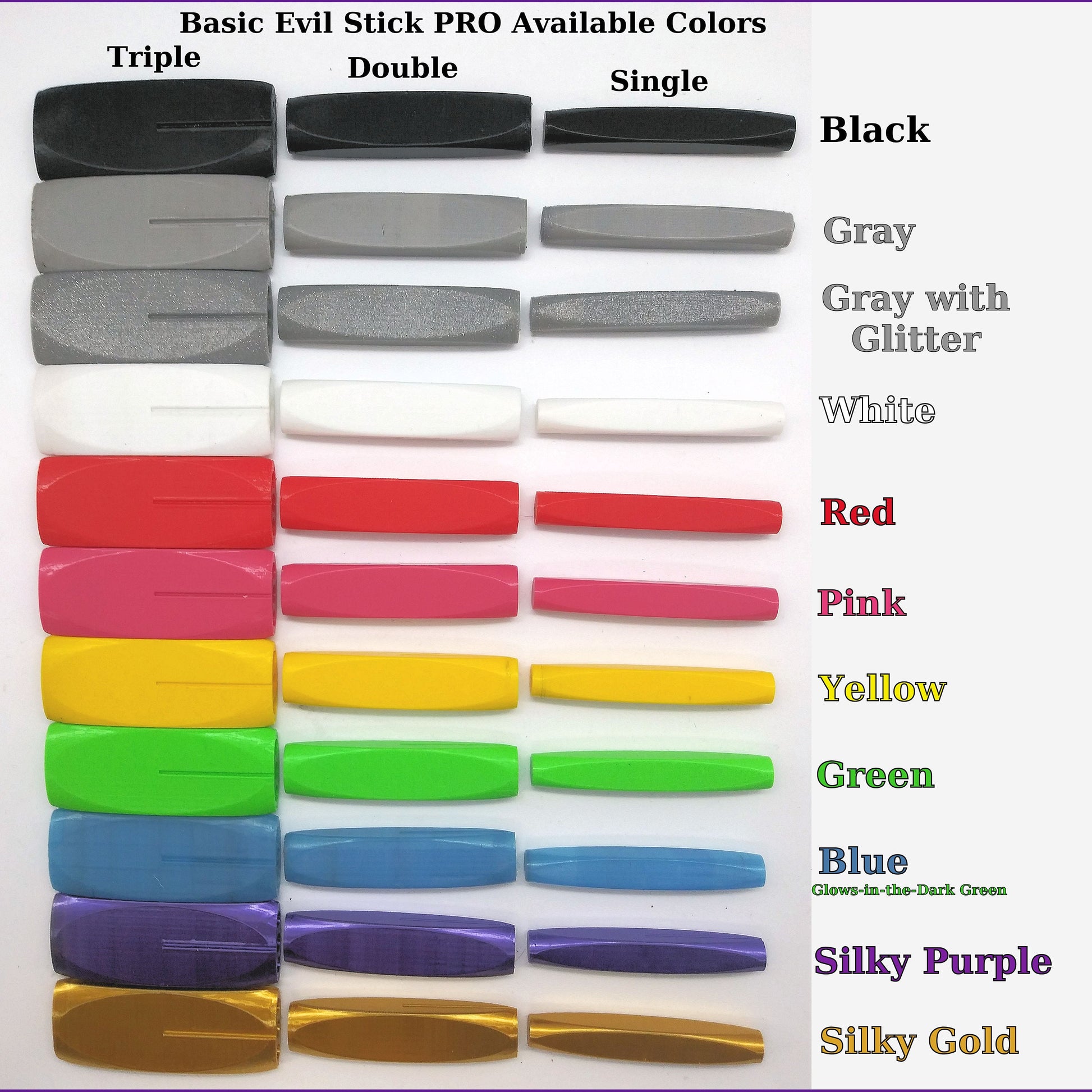 The Single, Double, and Rapid Fire Triple Evil Stick PRO Models are currently available individually, or as a set of all 3. The 3D printed handles are made of PLA (derived from renewable resources, more specifically from corn starch or sugar cane).