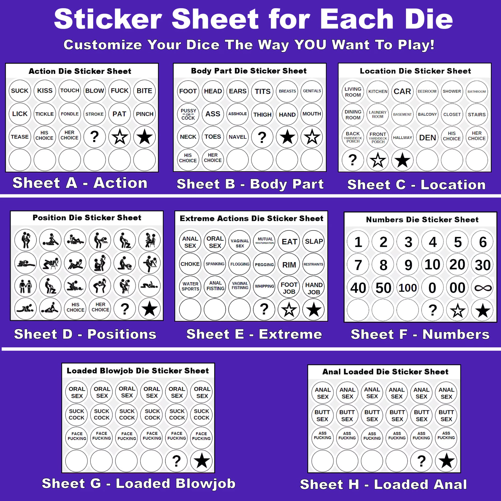 However, with these dice you get to choose one of the eight themed sheets of 24 stickers (some blanks) that you can choose from to customize your dice, making them the perfect dice for your sexual interests and desires.